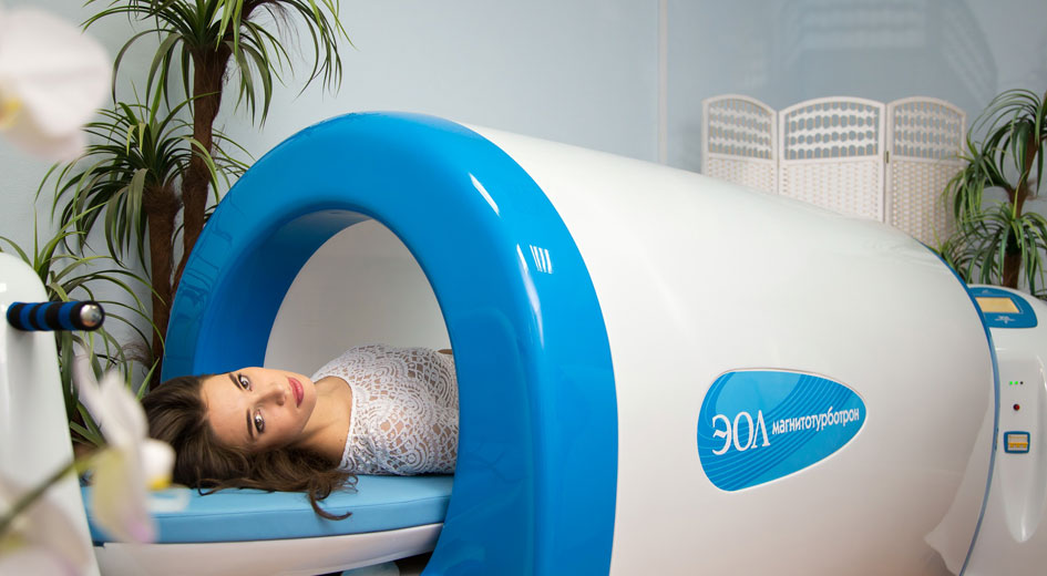 Магнитотурбтрон - аппарат для общей магнитотерапии. Представляет собой достаточно массивную установку, кушетку, на которую помещается пациент. Магнитное воздействие обеспечивается за счет создания вихревых полей вокруг тела человека. В процессе процедуры программируется частота магнитного поля, его направленность и индукция.